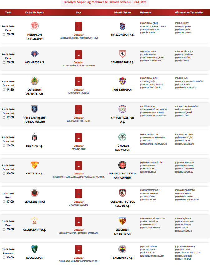 20. Haftanın programı ve görev yapacak hakemleri şu şekilde: