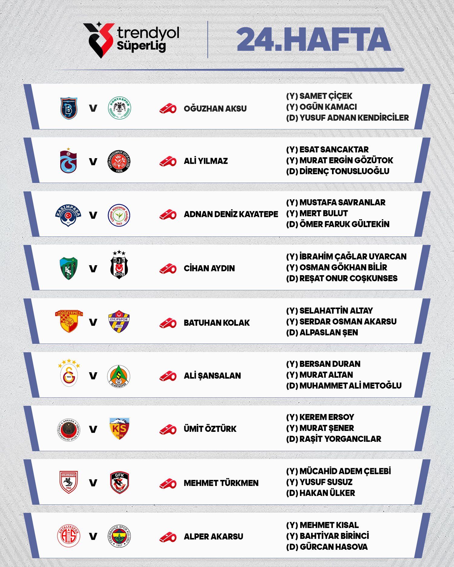 Trendyol Süper Lig’de 24. haftanın programı ve hakemleri şu şekilde