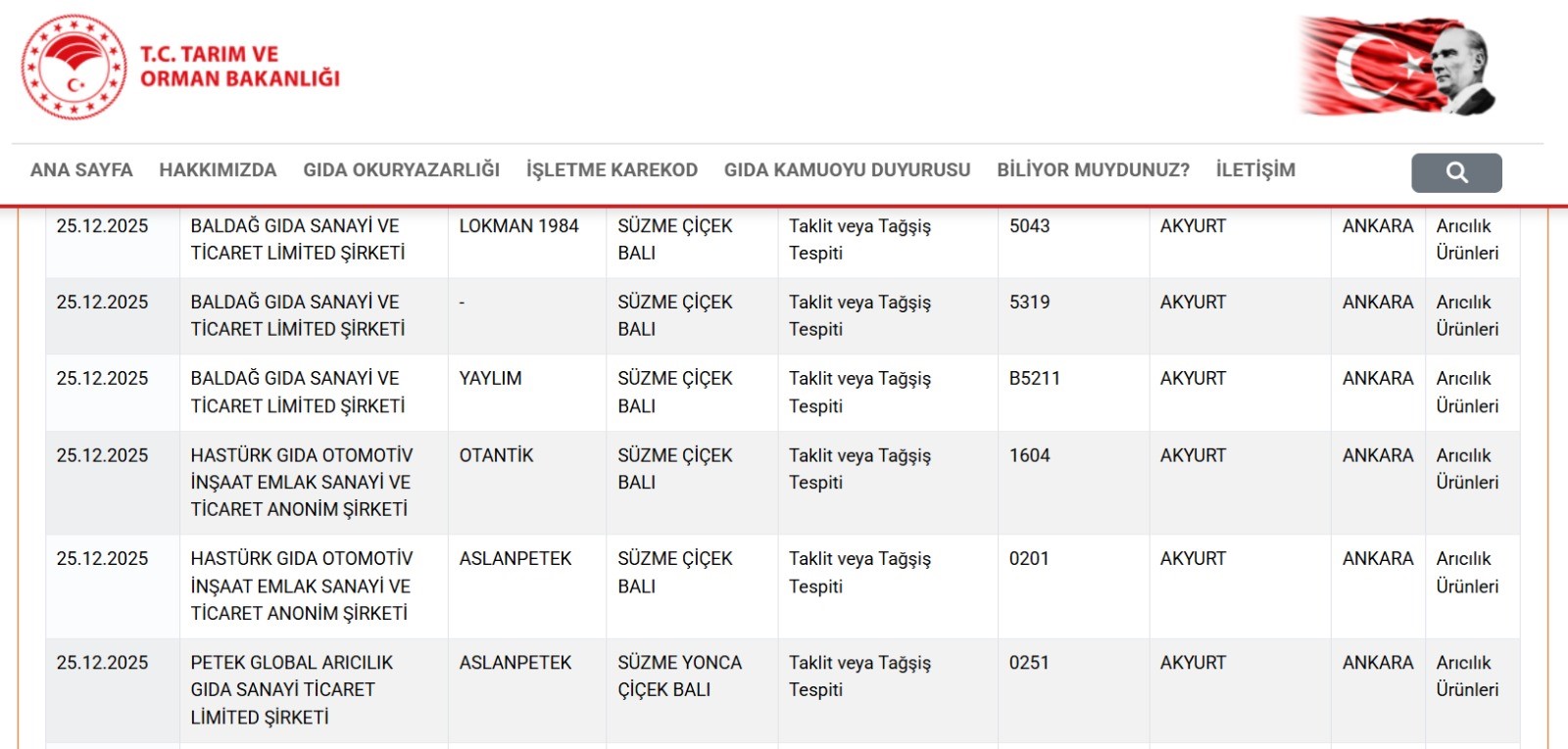 Bakanlığın 25 Aralık tarihli listesine göre; Baldağ Gıda Sanayi ve Ticaret Limited Şirketi’ne ait “Lokman 1984 Süzme Çiçek Balı”, markasız “Süzme Çiçek Balı” ve “Yaylım Süzme Çiçek Balı” ürünlerinde taklit veya tağşiş belirlendi.