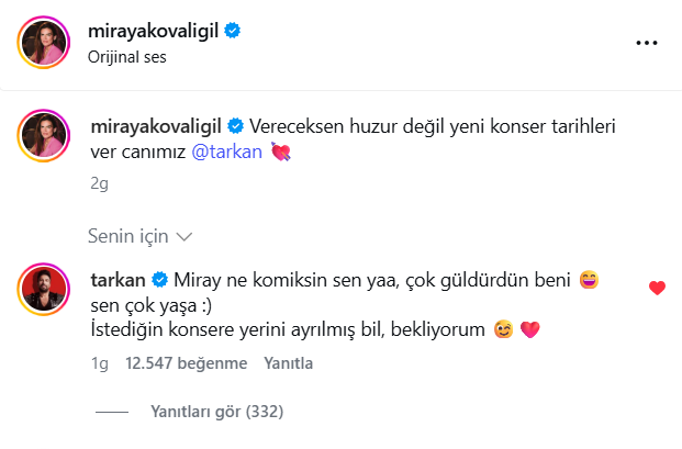 Paylaşımdan saatler sonra Tarkan’dan bu paylaşıma yanıt geldi. Akovalıgil’in videosunu izlerdikten sonra çok güldüğünü söyleyen Megastar müjdeyi ise şu paylaşımı ile verdi: Miray ne komiksin sen yaa, çok güldürdün beni. Sen çok yaşa. İstediğin konsere yerin ayrılmış bil, bekliyorum."