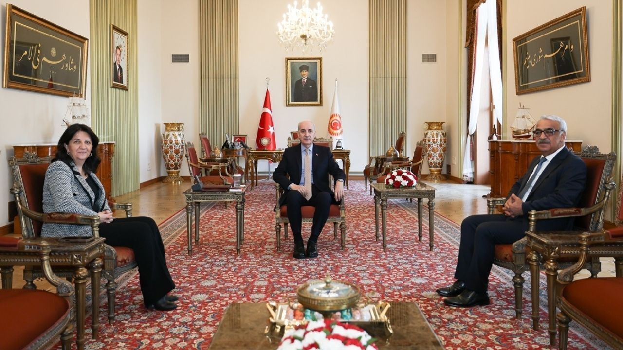 TBMM Başkanlığından yapılan açıklamaya göre, Kurtulmuş'un makamındaki kabul, basına kapalı gerçekleşti. TBMM'nin sosyal medya hesabından yapılan açıklamada, "Türkiye Büyük Millet Meclisi Başkanımız Numan Kurtulmuş, TBMM Başkan Vekili, DEM Parti Van Milletvekili Pervin Buldan ve DEM Parti Şanlıurfa Milletvekili Mithat Sancar'ı kabul etti" denildi. Görüşmenin ardından herhangi bir açıklama yapılmadı.
