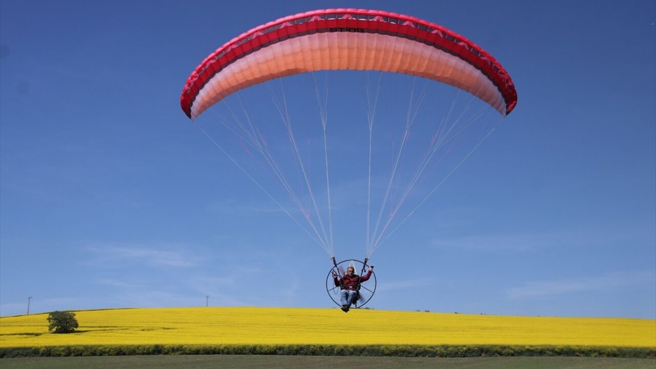 Gaziköy Mahallesi'nde hazırlıklarını tamamlayan Aksoy, sarıya bürünen kanola tarlası üzerinde yaklaşık yarım saat uçuş yaptı. Aksoy, kanola ve buğday tarlalarının güzelliklerini gökyüzünden izledikten sonra, güvenli şekilde iniş gerçekleştirdi.