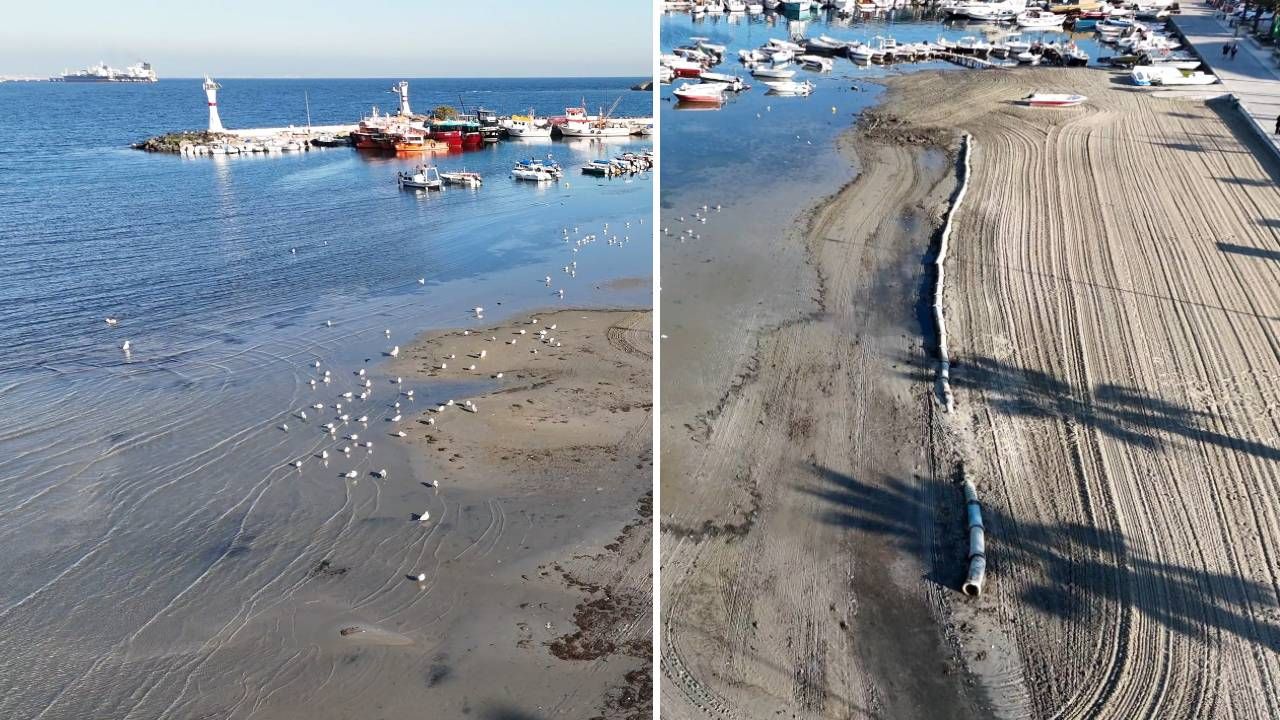 Tekirdağ'ın Marmaraereğlisi ilçesinde yaşanan deniz çekilmesi, drone ile havadan görüntülendi.