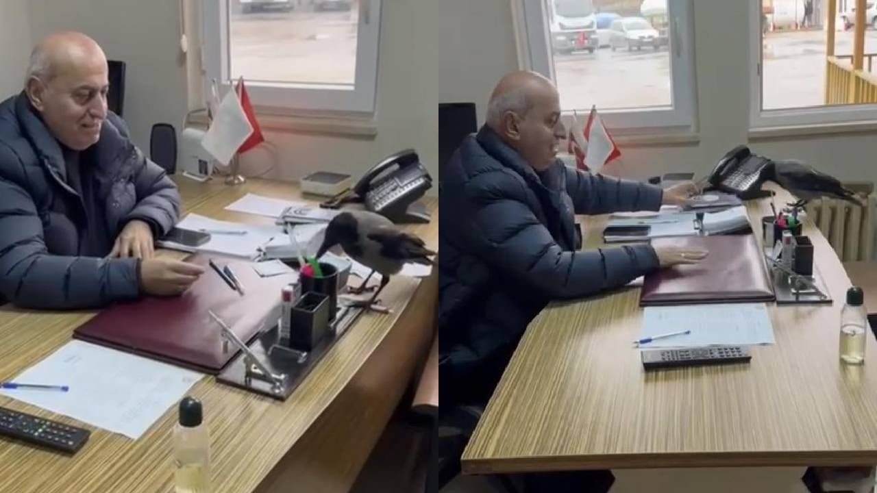 Görüntülerde, pencere önünde duran kargayı fark eden Başkan Cahit Erdem'in, "Gel gel, üşüdün mü?" diyerek şaşkınlığını dile getirdiği görülüyor. Başkanın çağrısı üzerine karga, pencereden içeri girerek masanın üzerine çıkıyor. Erdem, kargaya "Sana mama vereceğim, buraya gel" diyerek sesleniyor.