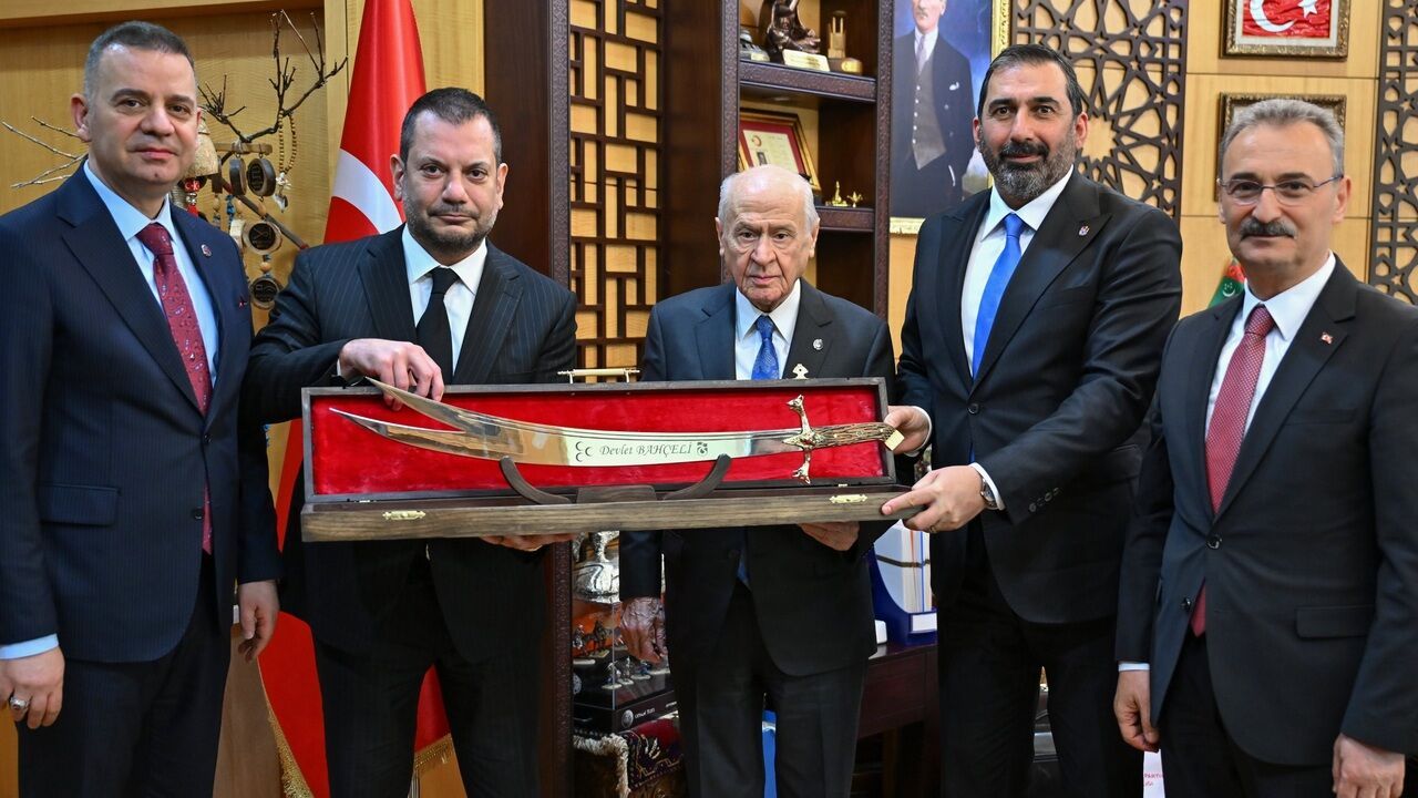 Gerçekleştirilen görüşmede, Devlet Bahçeli'ye 1975-1976 sezonunu simgeleyen retro beyaz formanın yanı sıra, özel işlemeli bir kılıç da takdim edildi.