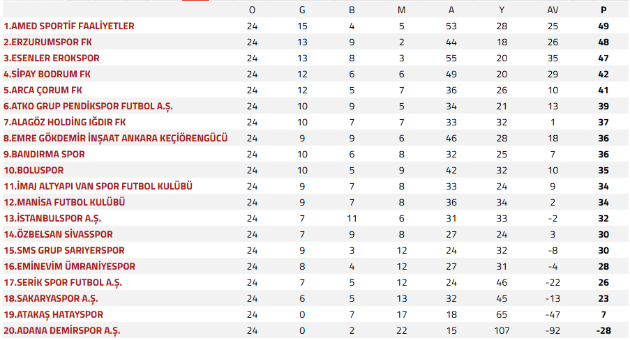 Lider Amed Sportif Faaliyetleri İstanbul deplasmanında Pendikspor’u 2-0 ile geçerek liderliğini 49 puanla sürdürdüğü 24.haftada; Erzumspor, Sakarayaspor deplasmanında hata yapmadı. 'Yiğidolar', liderin arkasında 48 puanda yer alıyorlar.