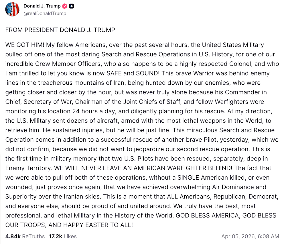 ABD Başkanı Donald Trump, operasyonun başarısını kendine ait Truth Social platformu üzerinden duyurdu. Askerin yaralı olduğunu ancak hayati tehlikesinin bulunmadığını belirten Trump, "Onu kurtardık!" mesajını paylaştı.