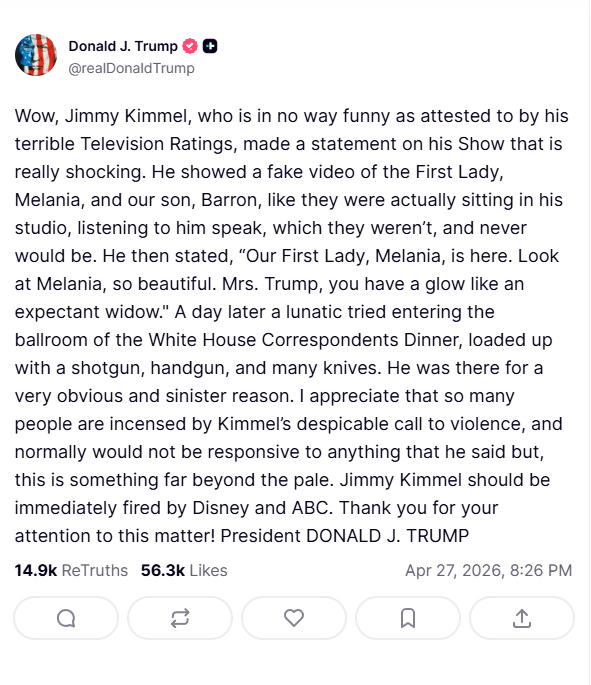 ABD Başkanı Donald Trump, ünlü talk-show sunucusu Jimmy Kimmel’ın First Lady Melania Trump hakkında yaptığı bir şakayı "şiddete çağrı" olarak nitelendirerek, yayıncı kuruluş Disney ve ABC’den sunucunun görevine son verilmesini talep etti. Beyaz Saray Muhabirleri Yemeği sonrası yaşanan güvenlik kriziyle derinleşen tartışma, medya ve siyaset dünyasında tansiyonu yükseltti.