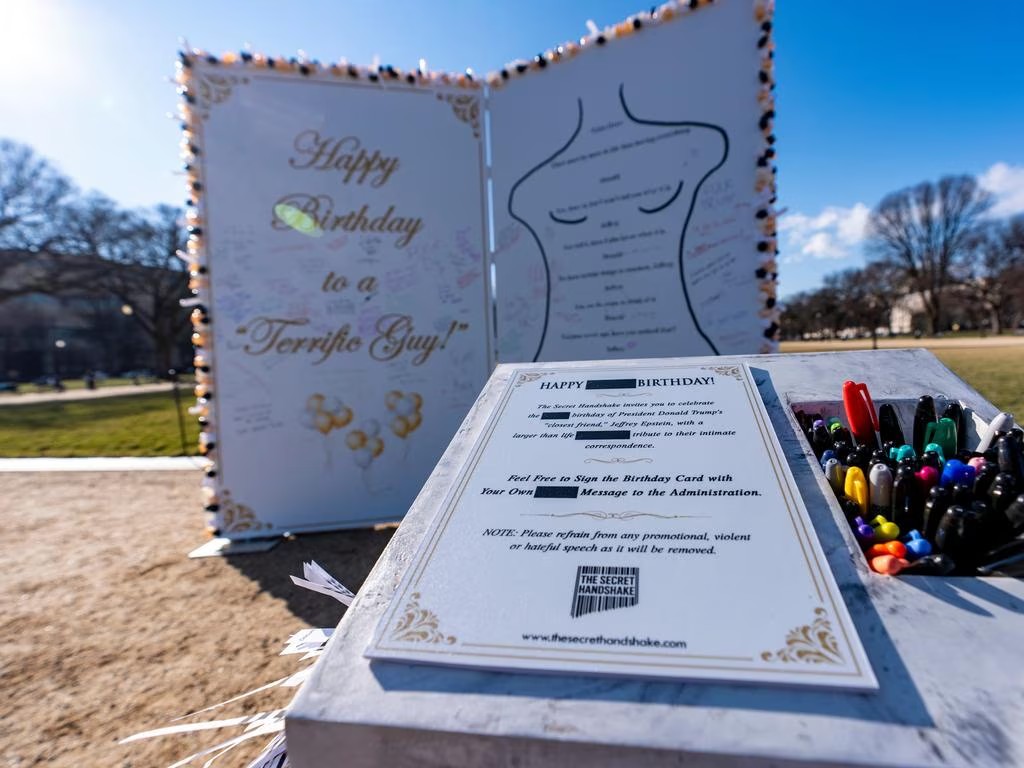 Kendisini “Secret Handshake” olarak tanımlayan bir grup, yaklaşık 3 metre yüksekliğinde bir enstalasyon kurdu. Kartın bir yüzünde, 2000’li yılların başında Epstein’e hediye edilen ve Trump’ın adının yazılı olduğu notun kopyası bulunuyor. Notta çıplak bir kadın silüeti ve “Doğum günün kutlu olsun ve her gün yeni bir harika sır olsun” ifadesi yer alıyor. Kartın diğer tarafında ise “Harika Bir Adama Mutlu Doğum Günü!” yazıyor. Ziyaretçiler, yanındaki levha aracılığıyla Trump yönetimine mesaj yazmak için kartı imzalayabiliyor.