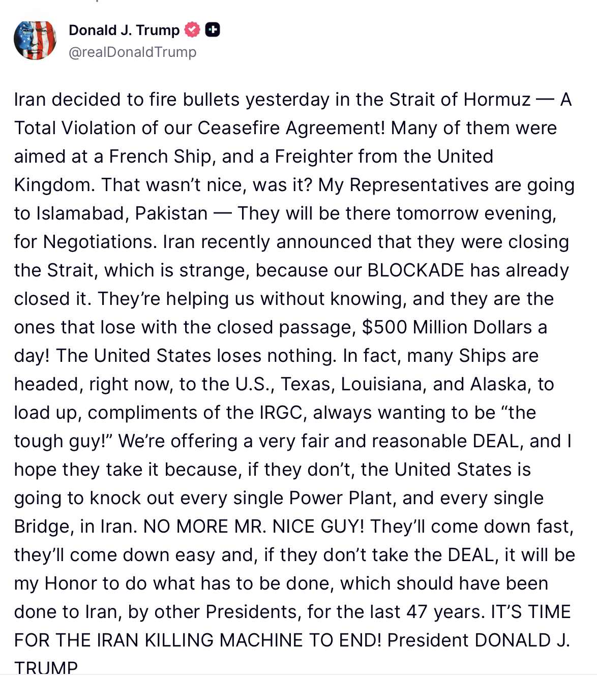 Trump, İran’ın Hürmüz Boğazı’nda ateşkesi tamamen ihlal ederek "kurşun atmaya" başladığını ve bir Fransız gemisi ile Birleşik Krallık’a ait bir kargo gemisini hedef aldığını duyurdu. İran’ın boğazı kapattığına dair açıklamasına alaycı bir dille yanıt veren Trump, ABD’nin deniz ablukasının (ABLUKA) zaten bölgeyi kapattığını vurguladı. Trump, "Bilmeden bize yardım ediyorlar; geçişlerin kapalı olması nedeniyle günde 500 milyon dolar kaybeden onlar, ABD hiçbir şey kaybetmiyor" ifadelerini kullandı.