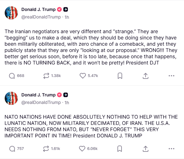 "İranlı müzakereciler çok farklı ve ‘tuhaf’. Bize bir anlaşma yapmamız için yalvarıyorlar. Askeri olarak yok edildikleri ve geri dönüş şansları sıfır olduğu için bunu yapmaları da normal. Ancak yine de kamuoyuna sadece teklifimizi incelediklerini söylüyorlar. Yanlış. Çok geç olmadan bir an önce ciddiye almaları iyi olur. Çünkü bir kez bu gerçekleşirse geri dönüş yoktur ve sonuç hiç de hoş olmayacaktır" ifadelerini kullandı.