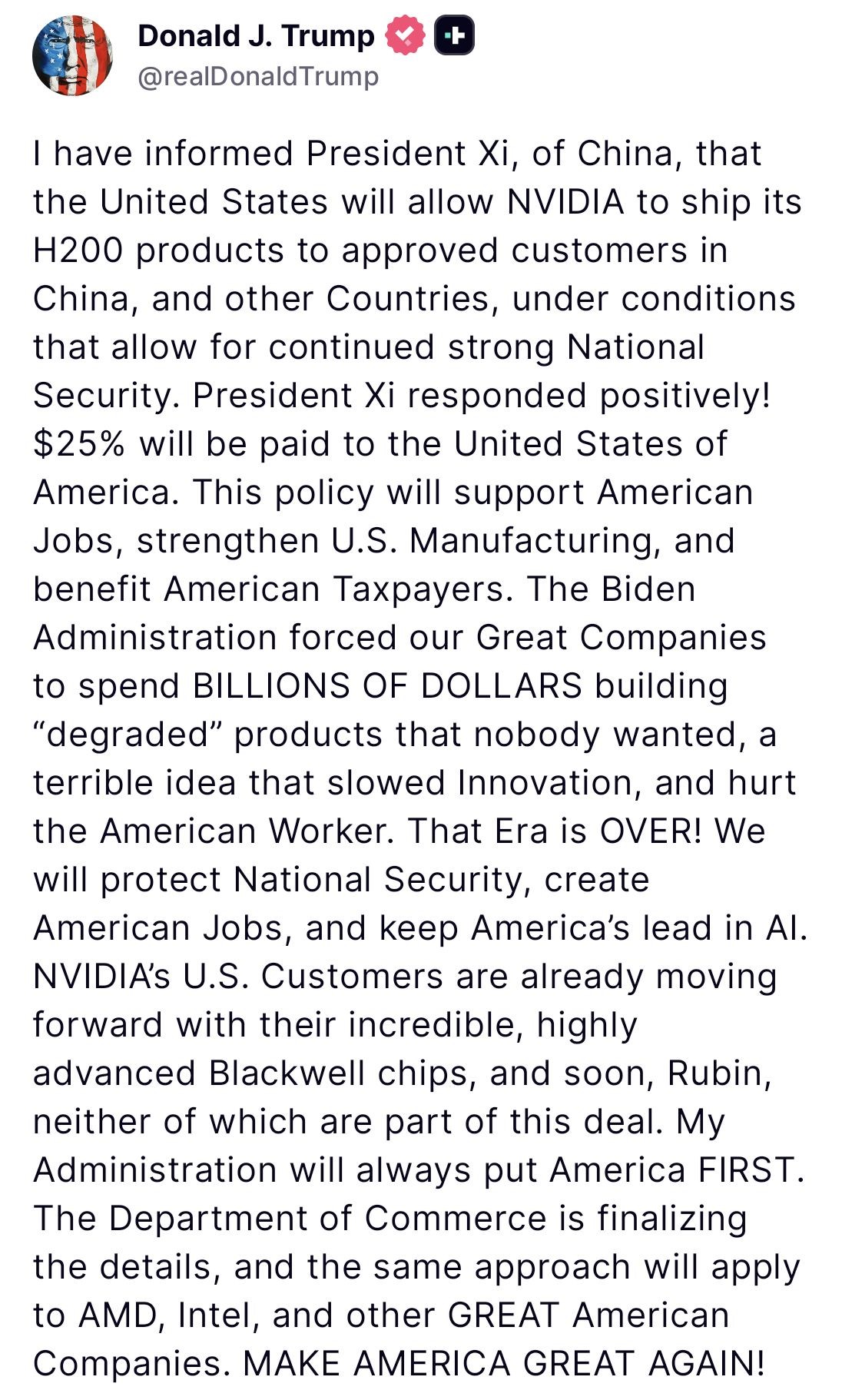 Trump, Truth Social üzerinden yaptığı paylaşımda, Çin Devlet Başkanı Xi Jinping’e “onaylı müşterilere, ulusal güvenliği koruyan koşullar altında” H200 ihracatına izin verileceğini ilettiğini belirterek, Xi’nin bu kararı olumlu karşıladığını duyurdu.