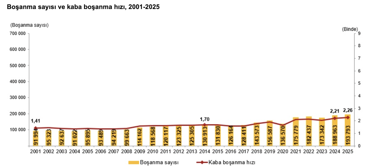 Boşanan çiftlerin sayısı ise artış gösterdi. 2024 yılında 188 bin 963 olan boşanma sayısı, 2025’te 193 bin 793’e yükseldi. Kaba boşanma hızı binde 2,26 olarak hesaplandı.