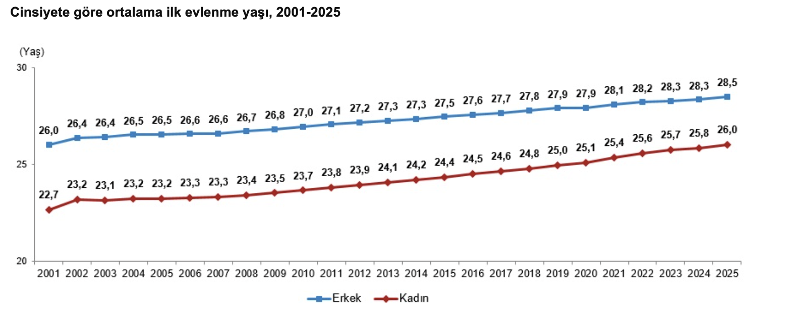 Ortalama ilk evlenme yaşı her iki cinsiyette de yükseldi. 2025 yılında erkeklerde ortalama ilk evlenme yaşı 28,5, kadınlarda ise 26,0 oldu. Erkek ile kadın arasındaki ortalama ilk evlenme yaş farkı 2,5 yaş olarak kaydedildi.