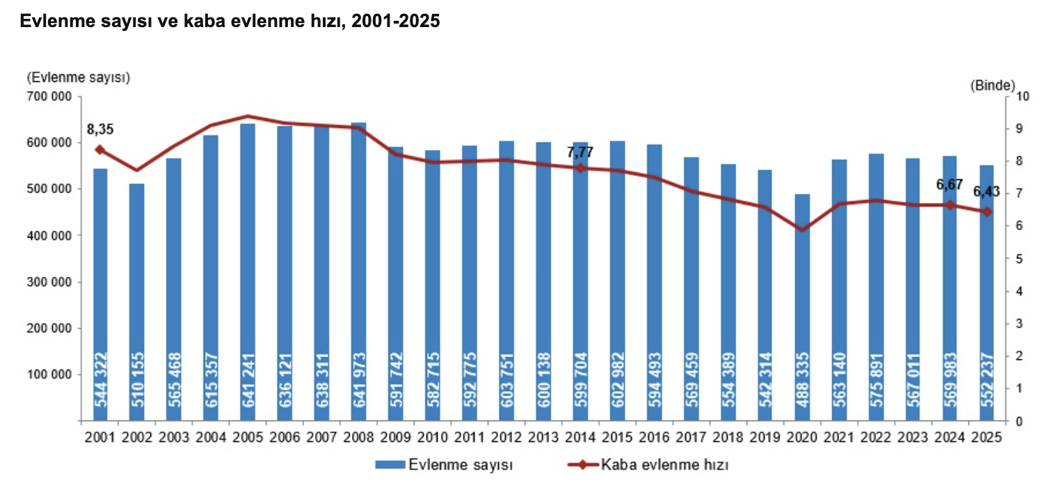 Türkiye İstatistik Kurumu (TÜİK), 2025 yılı Evlenme ve Boşanma İstatistikleri’ni yayımladı. Açıklanan verilere göre 2025 yılında evlenen çiftlerin sayısı 552 bin 237 oldu. Bu sayı 2024 yılında 569 bin 983 olarak kaydedilmişti. Bin nüfus başına düşen evlenme sayısını ifade eden kaba evlenme hızı ise 2025’te binde 6,43 olarak gerçekleşti.