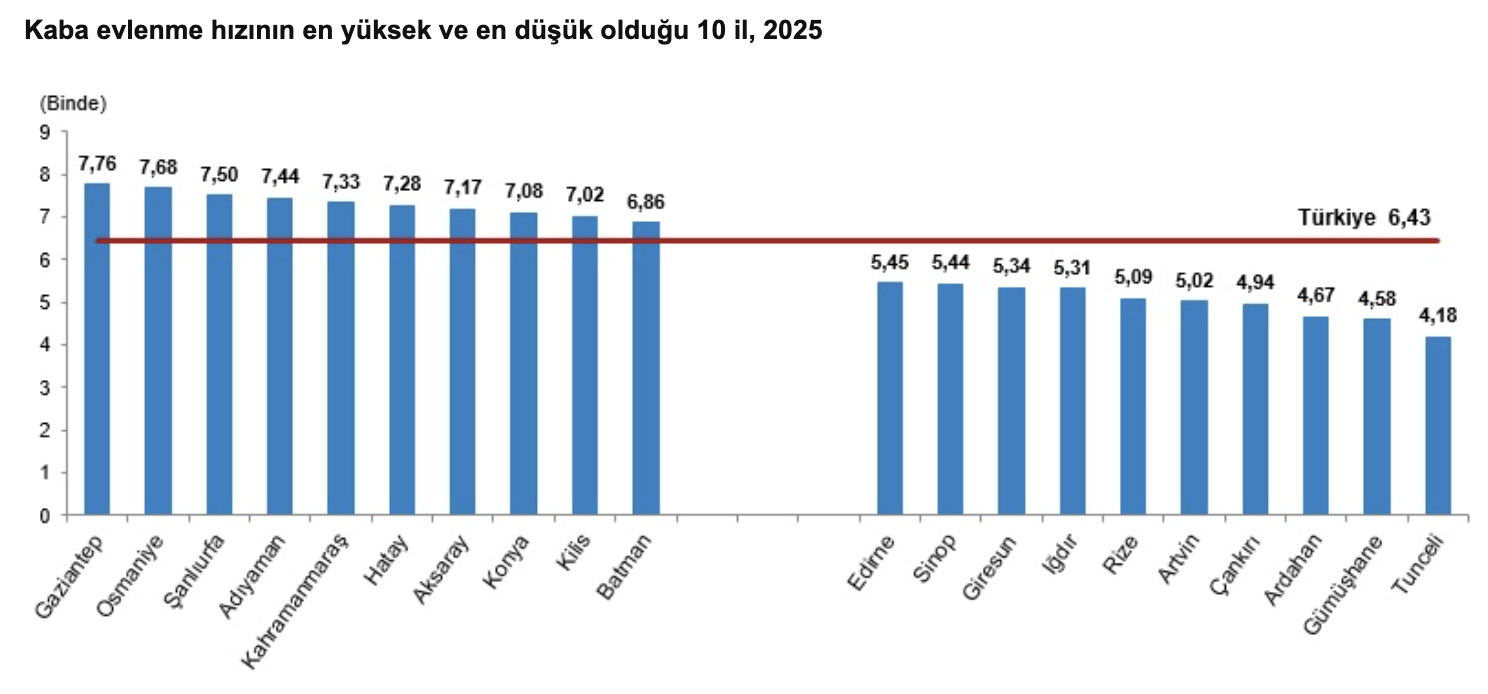 Kaba evlenme hızının en yüksek olduğu il binde 7,76 ile Gaziantep oldu. Gaziantep’i binde 7,68 ile Osmaniye ve binde 7,50 ile Şanlıurfa izledi. En düşük evlenme hızı ise binde 4,18 ile Tunceli’de görüldü. Tunceli’nin ardından Gümüşhane ve Ardahan geldi.