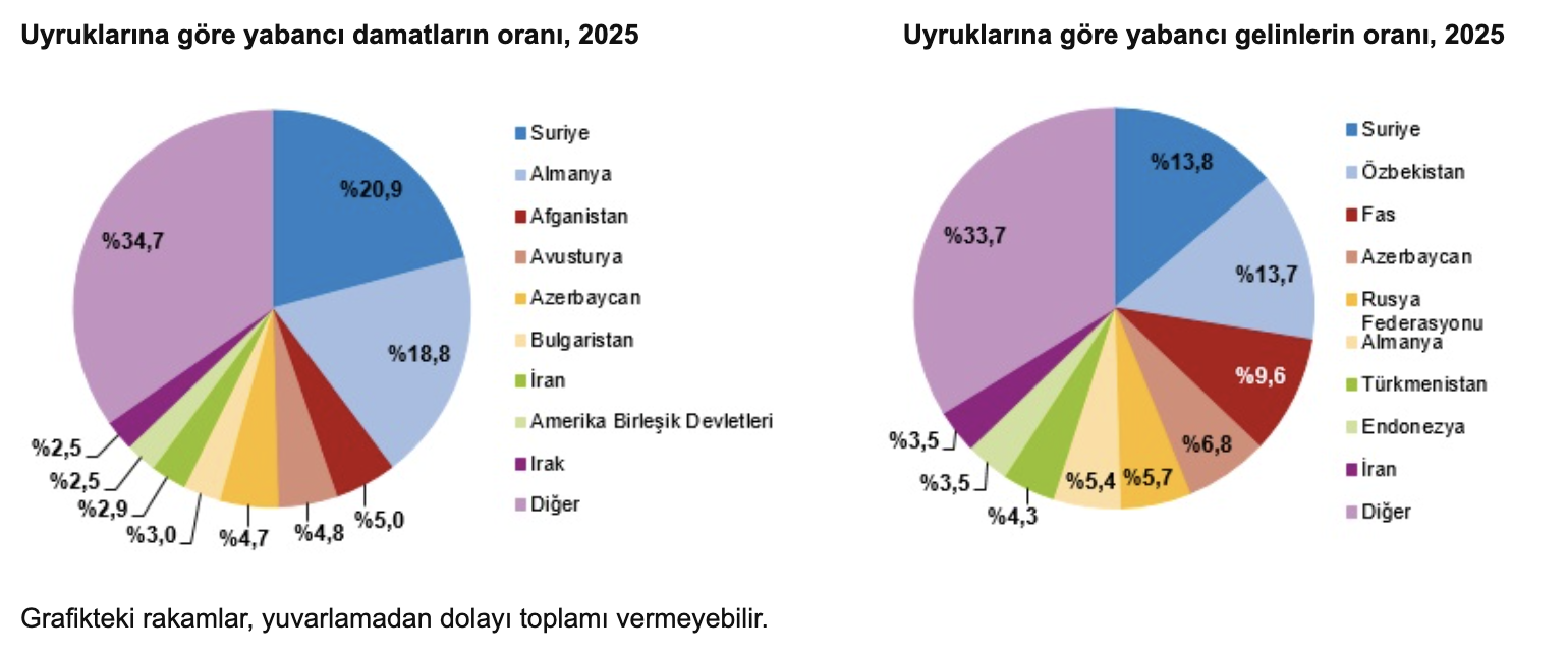 Yabancı uyruklularla yapılan evliliklerde ise yabancı gelin sayısının yabancı damat sayısının oldukça üzerinde olduğu görüldü. 2025 yılında yabancı damat sayısı 5 bin 347 ile toplam damatların yüzde 1,0’ını oluştururken, yabancı gelin sayısı 28 bin 646 ile toplam gelinlerin yüzde 5,2’sini oluşturdu. Yabancı damatlar arasında Suriyeliler yüzde 20,9 ile ilk sırada yer alırken, Alman ve Afgan damatlar onları izledi. Yabancı gelinlerde ise Suriyeliler yüzde 13,8 ile ilk sırada yer aldı; Özbek ve Faslı gelinler sonraki sıralarda bulundu.