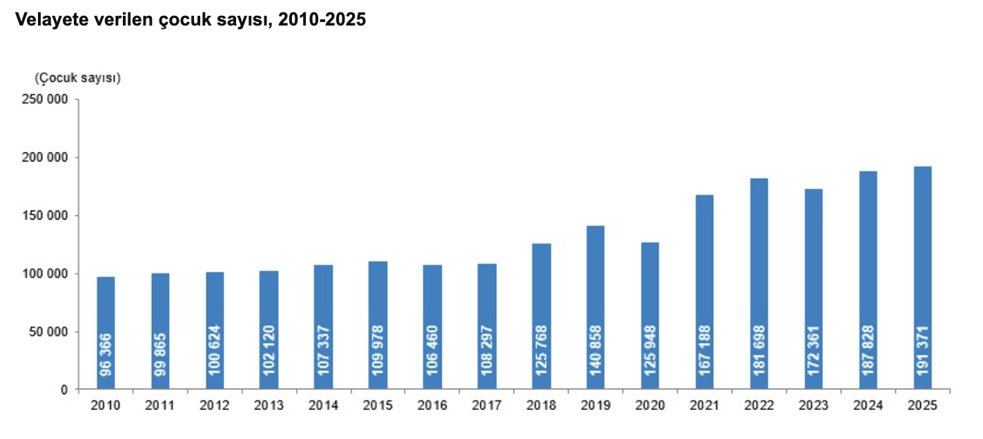 Kesinleşen boşanma davaları sonucunda 2025 yılında 191 bin 371 çocuk velayete verildi. Velayetlerin yüzde 74,6’sı anneye, yüzde 25,4’ü babaya bırakıldı.