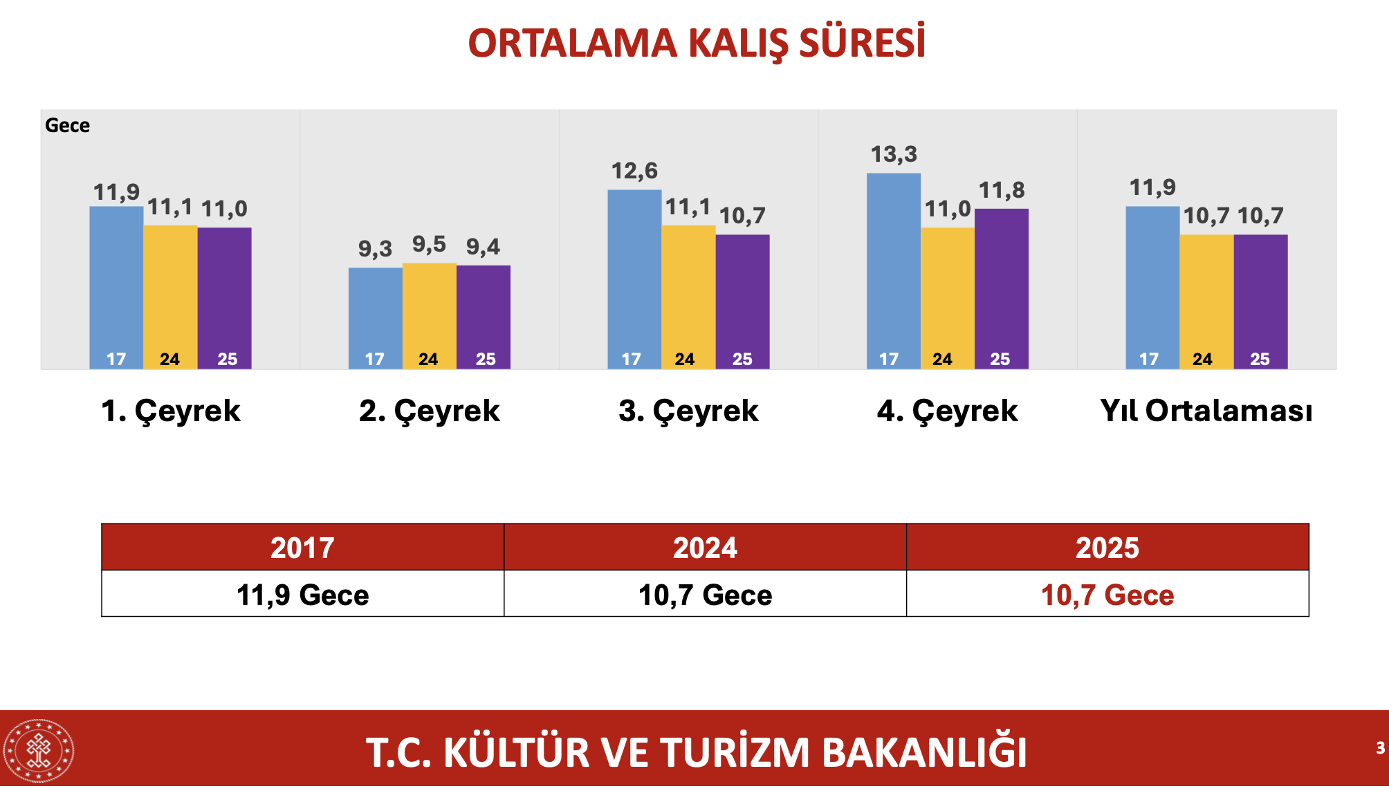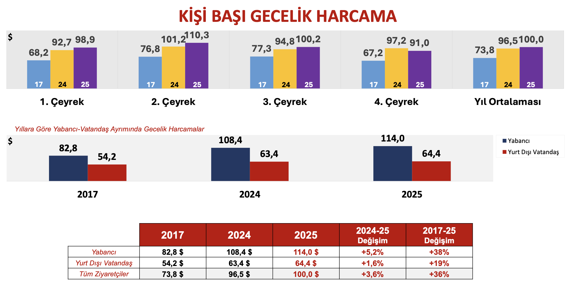 Bu çeyrekte ülkemizde geceleme yapan ziyaretçilerin gecelik ortalama harcaması 91 dolar oldu. Yurt dışında ikamet eden vatandaşların gecelik ortalama harcaması ise 57 dolar oldu.