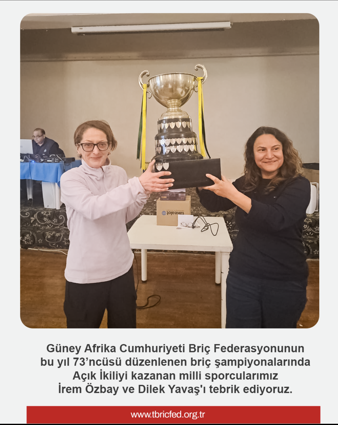 Güney Afrika Cumhuriyeti Briç Federasyonu tarafından bu yıl 73’üncüsü düzenlenen uluslararası briç şampiyonasında Türkiye’yi temsil eden milli sporcular İrem Özbay ve Dilek Yavaş önemli bir başarıya imza attı. Açık İkili kategorisinde mücadele eden milli ikili, turnuva boyunca sergiledikleri istikrarlı performansla rakiplerini geride bırakarak şampiyonluk kupasının sahibi oldu.