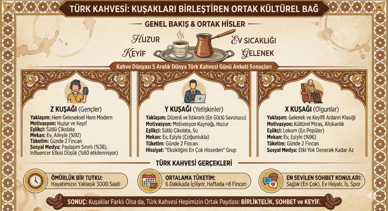X, Y ve Z kuşaklarının katılım gösterdiği ankette, her kuşağın Türk kahvesini sahiplendiği ve bu lezzetin herkesi ortak bir paydada buluşturduğu görüldü. Gençlerden yetişkinlere tüm kuşaklarda Türk kahvesinin farklı motivasyonlar uyandırdığı açıklanırken; ortak his “huzur, keyif ve ev sıcaklığının değişmez simgesi” kavramlarını bir araya getiriyor.