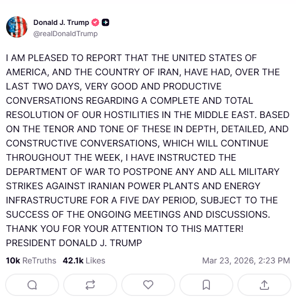 Sürece dair en somut işaret, bizzat Başkan Donald Trump’tan geldi. Truth Social üzerinden bir mesaj paylaşan Trump, son iki gündür yürütülen temasları "verimli" olarak nitelendirirken, diplomasiye şans tanımak adına askeri kanada talimat verdiğini duyurdu. Trump, "Toplantıların başarısına bağlı olarak, İran'ın enerji altyapısına yönelik tüm askeri saldırıların 5 gün süreyle ertelenmesi talimatını verdim" ifadelerini kullandı.