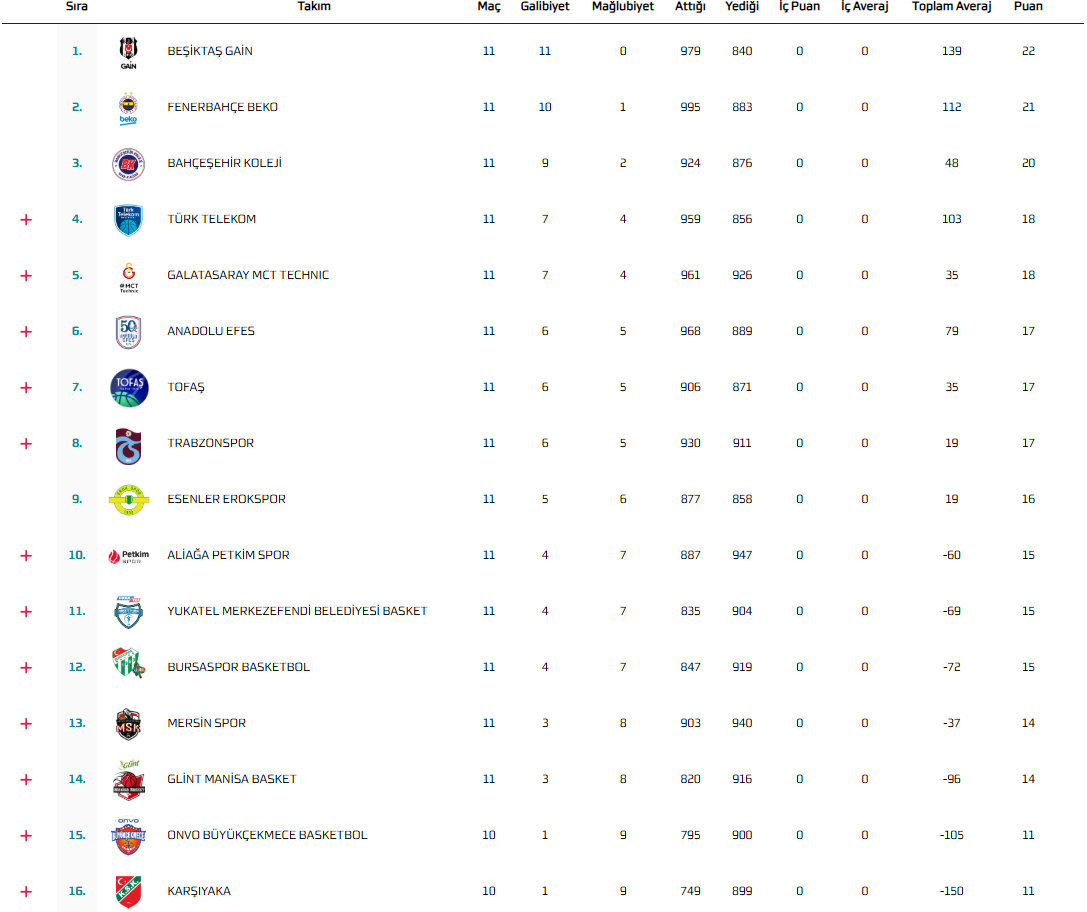 Türkiye Sigorta Basketbol Süper Ligi'nde Beşiktaş Gain namağlup liderliğini devam ettirdi. Bahçeşehir Koleji'ni deplasmanda 88-95'lik skorla geçen Beşiktaş Gain 22 puan'la en yakın rakibi Fenerbahçe Beko'nun 1 puan önünde liderliğini sürdürdü. Türkiye Sigorta Basketbol Süper Ligi'nin 11.haftası'nda oynanan maçlardan sonra oluşan puan tablosu şu şekilde: