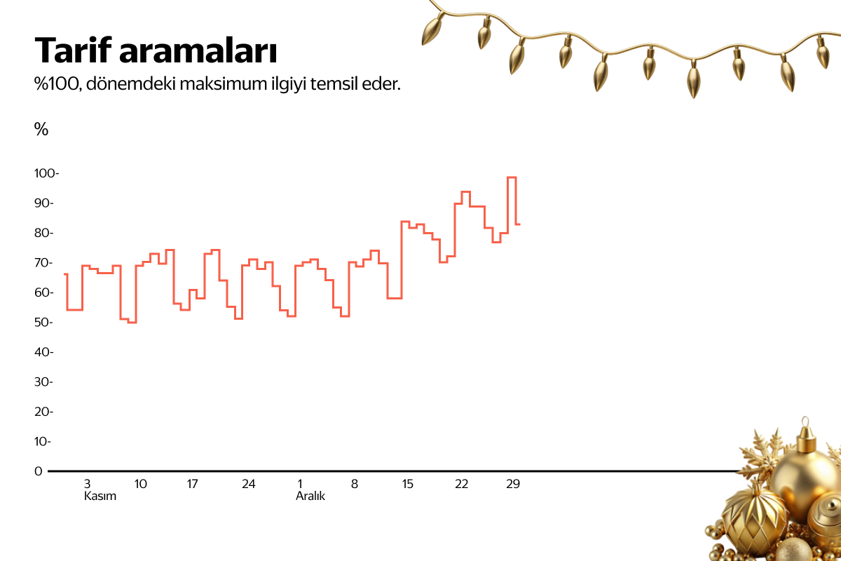 Veriler, Kasım–Aralık 2024 döneminde yemek tarifi aramalarında %12'lik önemli bir artış olduğunu gösteriyor. 30 Aralık'ta zirve yapan aramalar, kasım ayı ortalamasından 1,5 kat daha fazla.