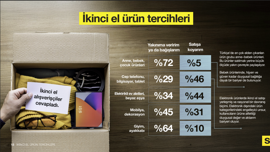 Araştırma, Türkiye’de ikinci el döngüsünün yalnızca ekonomik gerekçelerle değil, duygusal tercihlerle de şekillendiğini gösteriyor. Anne–bebek ürünlerinde bağış oranı yüzde 72’ye kadar çıkıyor. Elektronik ürünlerde ise satış eğilimi daha güçlü; bu kategoride satış oranı yüzde 40’ın üzerinde. Veriler, bazı ürünlerde duygusal bağlılığın etkili olduğunu, bazı kategorilerde ise ikinci el alışverişin yerleşik bir davranış haline geldiğini ortaya koyuyor.