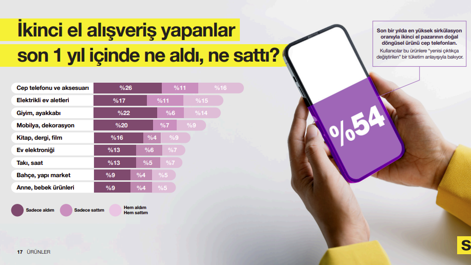 Araştırma, ikinci el pazarında en yoğun hareketliliğin cep telefonu ve aksesuarlarında olduğunu ortaya koyuyor. Bu kategori toplam pazarın yüzde 54’ünü oluşturuyor. Bu yüksek ilgi, yenilenmiş elektronik ürünlere yönelik talebi de artırıyor. Diğer kategorilerde giyim ve ayakkabı yüzde 42, bilgisayar ve tablet yüzde 45, elektrikli ev aletleri ise yüzde 41 oranında pay alıyor. Kadınlar anne–bebek ürünleri, giyim ve mobilya–dekorasyon kategorilerine yönelirken; erkekler daha çok elektronik ürünleri tercih ediyor.