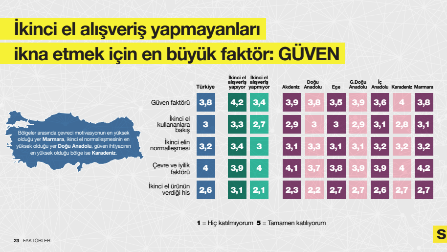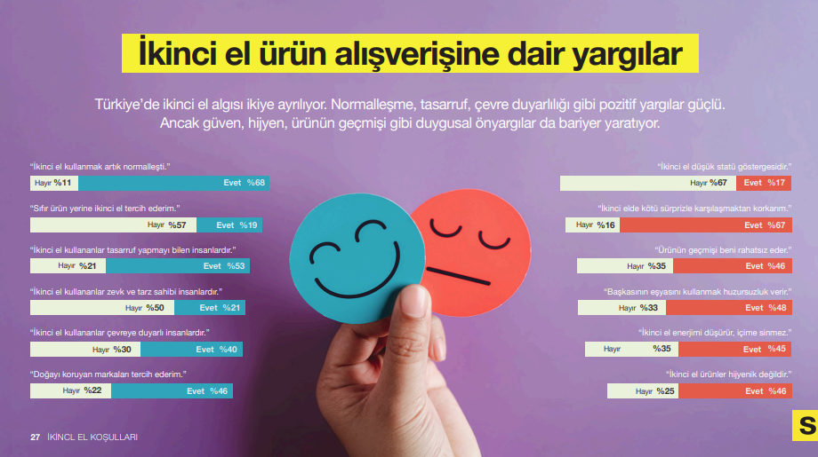 KONDA Araştırma ve Danışmanlık Genel Müdürü Aydın Erdem, yaptığı açıklamada: "Türkiye'de ikinci el alışveriş artık yalnızca bir seçenek değil. Veriler, bu davranışın bilinçli tüketim ve çevre duyarlılığının birleştiği yeni bir akışa dönüştüğünü gösteriyor. Özellikle genç ve eğitimli kesimde ikinci elin hızla normalleşmesi, toplumsal dönüşümün önemli bir işareti. İkinci elin önünde duran sosyal algı engellerinin etkileri artık yaygın değil. Bu durum, ikinci el alışverişi sürdürülebilir yaşamın güçlü bir parçası haline getiriyor.”