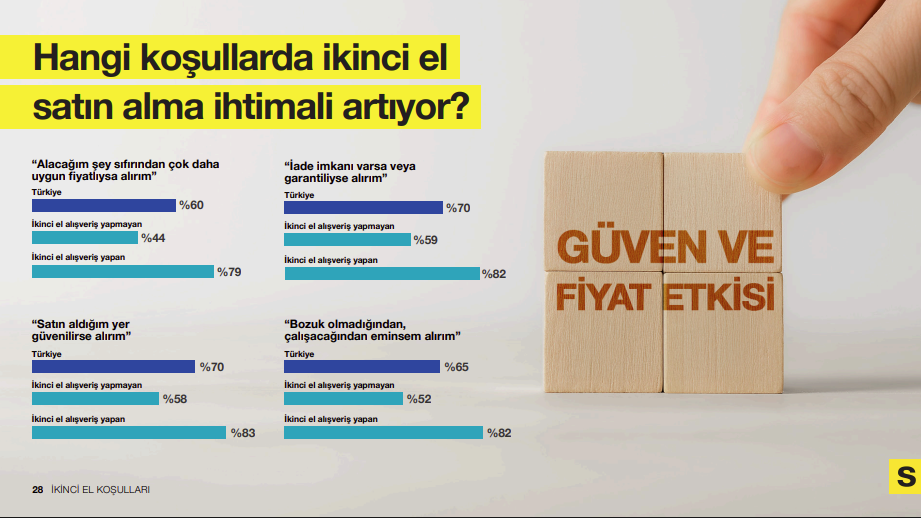 Araştırma, ikinci el alışverişte kararsız kalan tüketiciler için en belirleyici unsurun güven olduğunu gösteriyor. “Satıcı güven verirse alırım” diyenlerin oranı yüzde 83. “Ürün arızalı değilse alırım” diyenler yüzde 82, “garanti veya iade imkânı varsa alırım” diyenler de yine yüzde 82 seviyesinde.