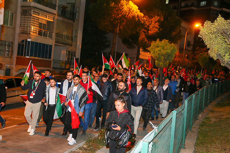 Uşak’ta Atapark’ta toplanan vatandaşlar, Filistin bayrakları ve kefiyelerle yürüyüş yaptı. Kur’an-ı Kerim okunup dua edilen etkinlikte, Filistin’e destek mesajları verildi.