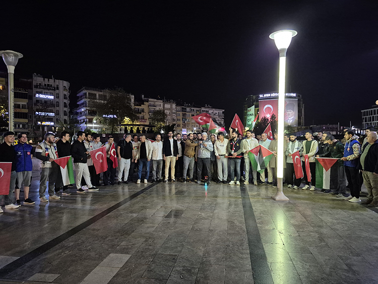Aydın’ın Efeler ilçesindeki İstasyon Meydanı’nda toplanan grup, saldırıyı kınadı. Katılımcılar, Sumud Filosu’ndan gelecek haberleri meydanda takip edeceklerini belirtti.
