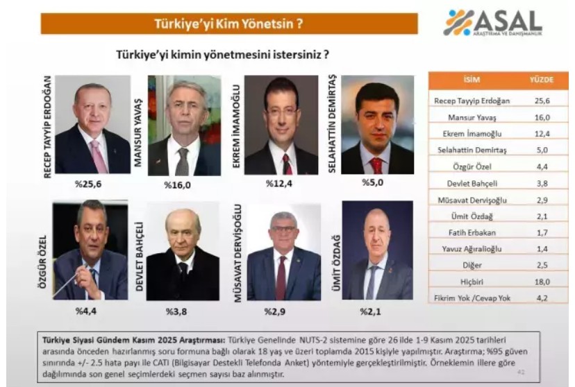ASAL Araştırma ve Danışmanlık, Kasım 2025 dönemine ait "Türkiye'yi kim yönetsin?" başlıklı anketinin sonuçlarını paylaştı. 26 ilde 1–9 Kasım tarihleri arasında 18 yaş ve üzeri 2.015 kişiyle CATI idaresiyle yapılan çalışmada seçmene "Türkiye'yi kimin yönetmesini istersiniz?" sorusu soruldu.