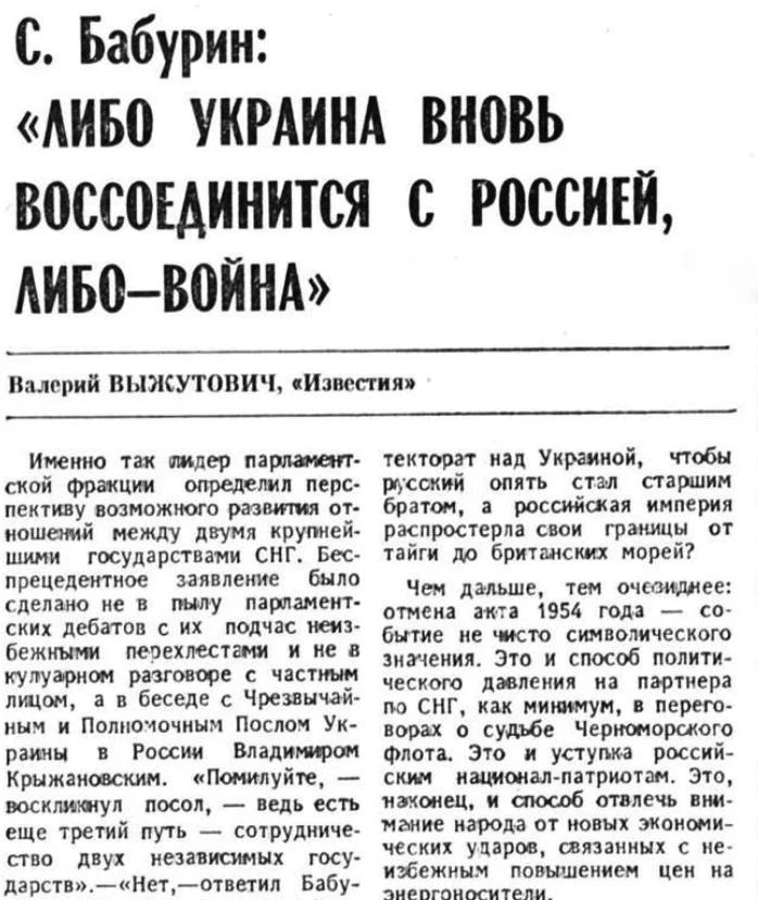 Gazeteci Vyshutovich’in 33 yıl önce kaleme aldığı satırlar bugün dikkat çekici bir anlam taşıyor. Yazıda Baburin’in sözleri, “Rusya’nın Ukrayna ile bağlarını koparmaya yönelik, Ukrayna’nın bir devlet olarak varlığını sona erdirecek adımların habercisi” olarak yorumlanıyordu.