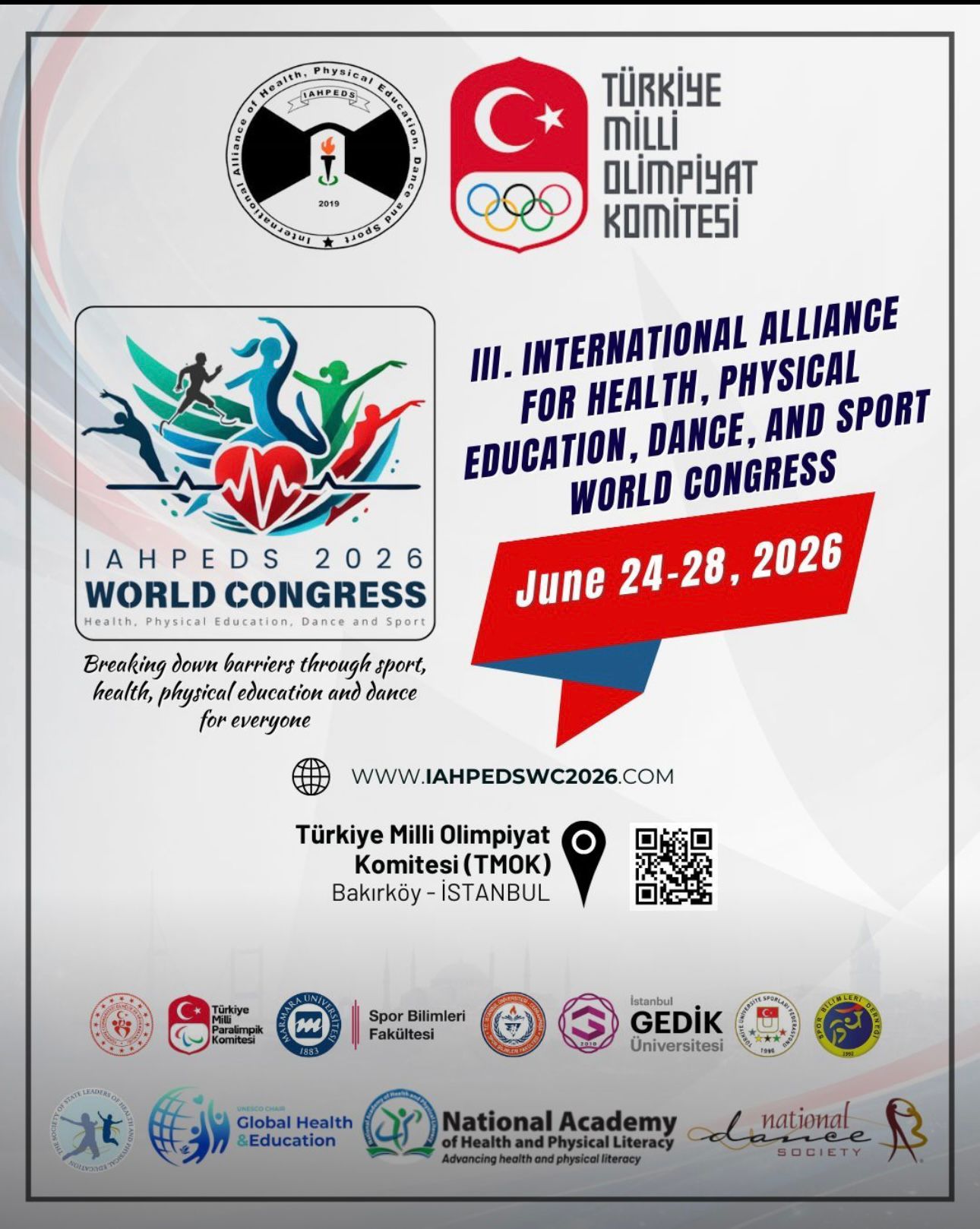 Uluslararası Sağlık, Beden Eğitimi, Dans ve Spor Birliği (IAHPEDS) tarafından düzenlenen IAHPEDS 2026 Dünya Kongresi, 24–28 Haziran 2026 tarihleri arasında Türkiye Milli Olimpiyat Komitesi ev sahipliğinde İstanbul’da gerçekleştirilecek.