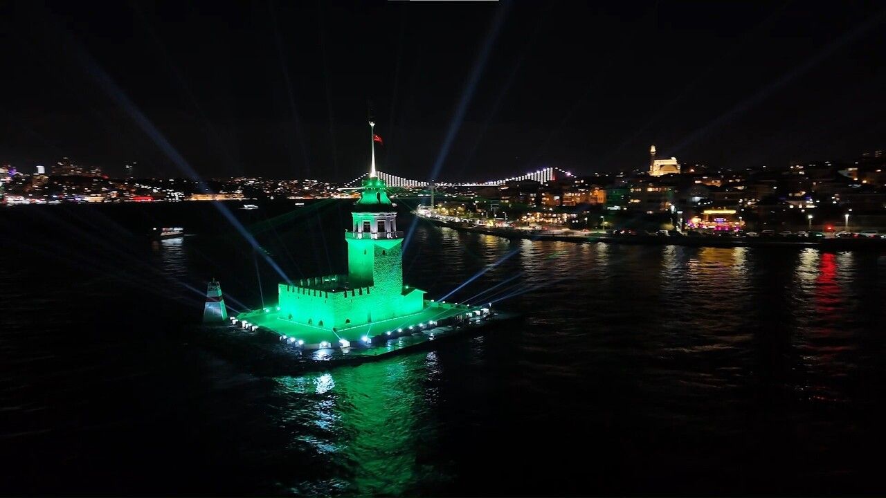 Dron ile kaydedilen görüntülerde, Kız Kulesi’nin ışıklarla oluşturduğu etkileyici görsel ve Boğaz hattının gece silueti net bir şekilde görüldü.