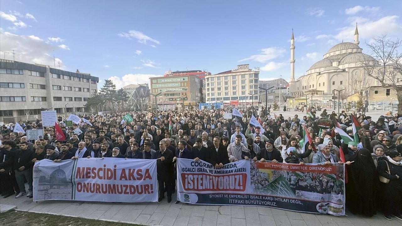 Kalabalık, "Filistin elbet özgür olacak", "Bir adım ötede insanlık ölüyor", "Bir çocuğun gökyüzüne bakarken kurduğu hayal bombalarla yarım kalmamalı", "Kibir ve zulme karşı sabır, iman, cihat" yazılı dövizler taşıdı.