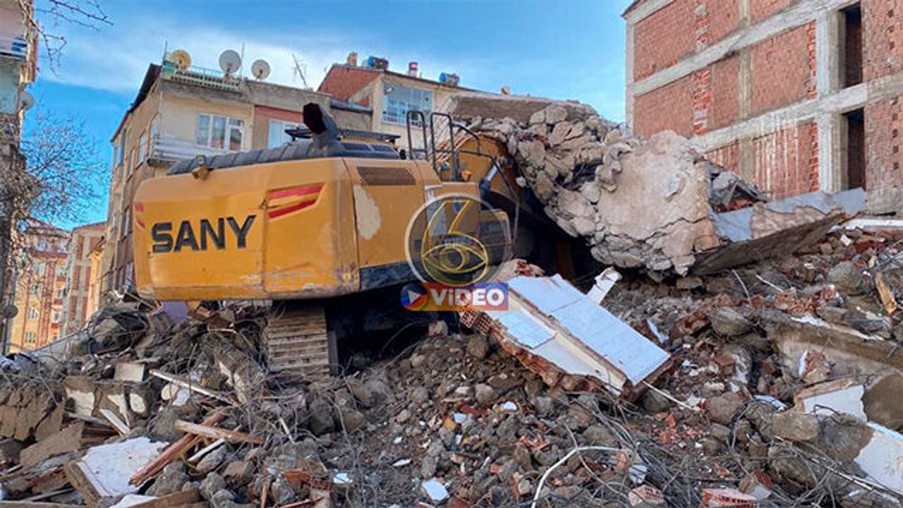 Elazığ’da 6 Şubat depremlerinde ağır hasar alan 4 katlı binanın kontrollü yıkımı sırasında, bina aniden iş makinesinin üzerine devrildi. Faciadan dönülen olayda iş makinesi operatörü yara almadan kurtuldu.