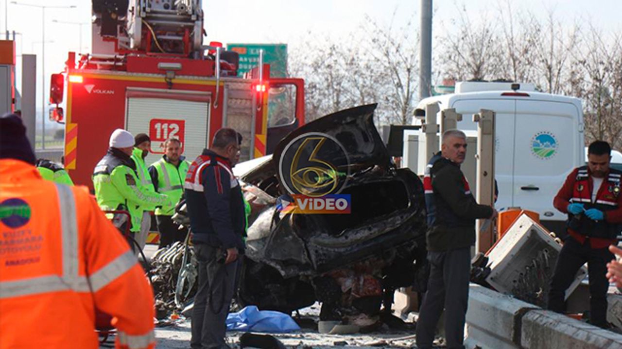 Kuzey Marmara Otoyolu Sakarya geçişinde kontrolden çıkan otomobili, bariyerlere çarparak gişelere ok gibi saplandı. Alev alan otomobilde sürücü hayatını kaybetti.