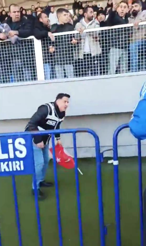 Maç sırasında Çankırı FK taraftarları arasında çıkan tartışmada bir taraftarın elindeki Türk bayrağı yere düştü.