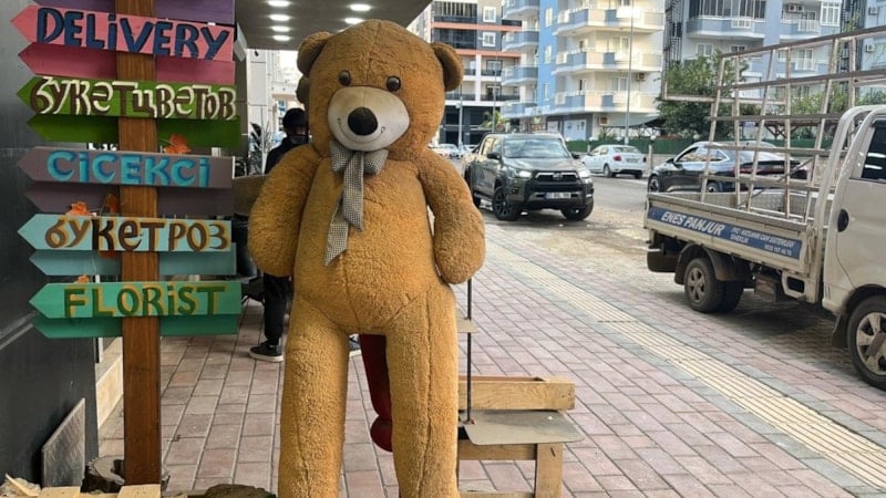 Antalya'nın Alanya ilçesine bağlı Mahmutlar Mahallesi Atatürk Caddesi üzerindeki bir çiçekçi dükkanına gece saatlerinde motosikletle gelen iki şüpheli, dükkanın çevresini kontrol ettikten sonra kapı altına 100 TL bıraktı ve yaklaşık 5 bin TL değerindeki büyük pelüş ayıyı alarak kaçtı.
