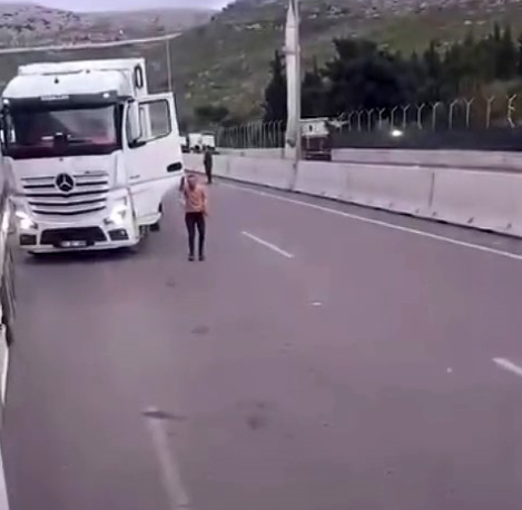 Darp edilen tır sürücüsü tarafından saldırı anları kayıt altına alındı. Görüntülerde, kızgın tır sürücüsünün aracından inerek meslektaşına demir sopayla saldırdığı, araca zarar verdiği ve küfür ile hakaret ettiği görüldü.