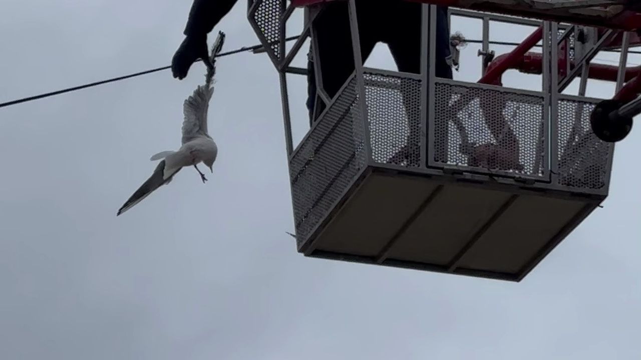 Zonguldak Limanı girişinde tel örgülere kanadı takılan ve asılı kalan martı, itfaiye ekiplerinin titiz çalışmasıyla kurtarıldı. Vatandaşların dikkati sayesinde hayata tutunan martı, ekiplerce yeniden gökyüzüne salındı.