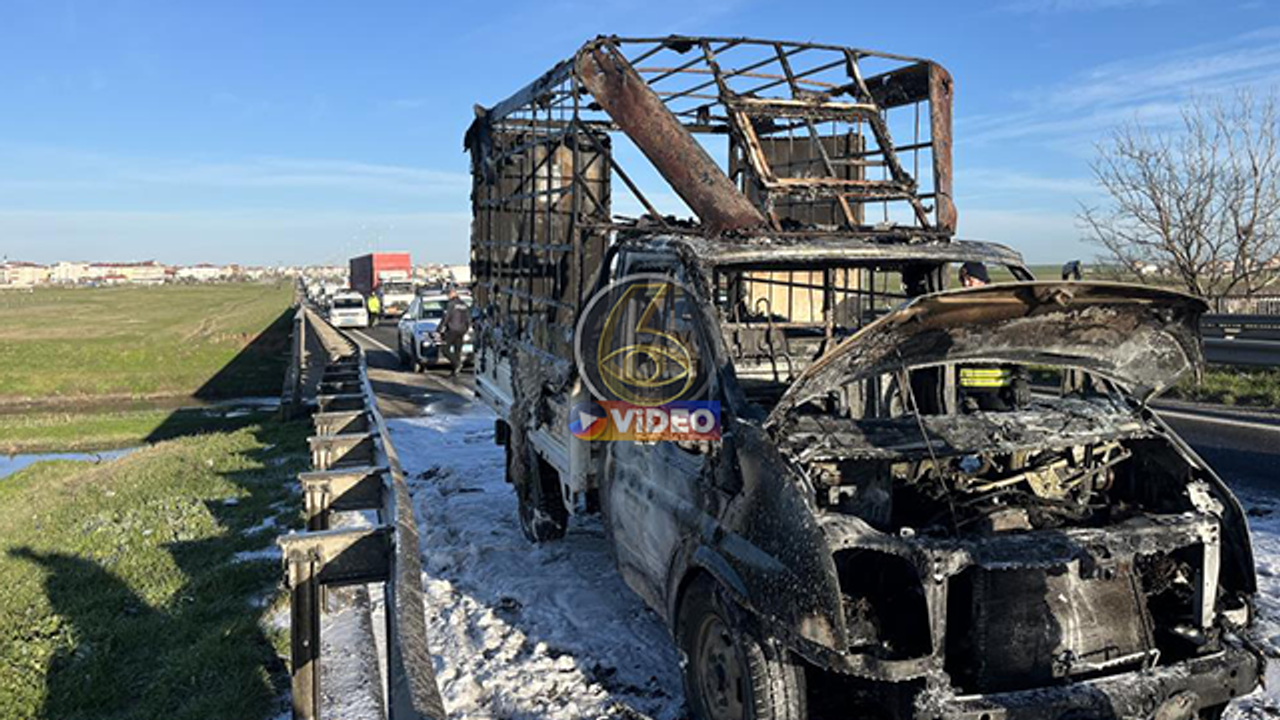 Tekirdağ Çorlu-Ergene yolunda bir anda alev alan kamyonet dakikalar içinde demir yığınına döndü; sürücü yara almadan kurtuldu.