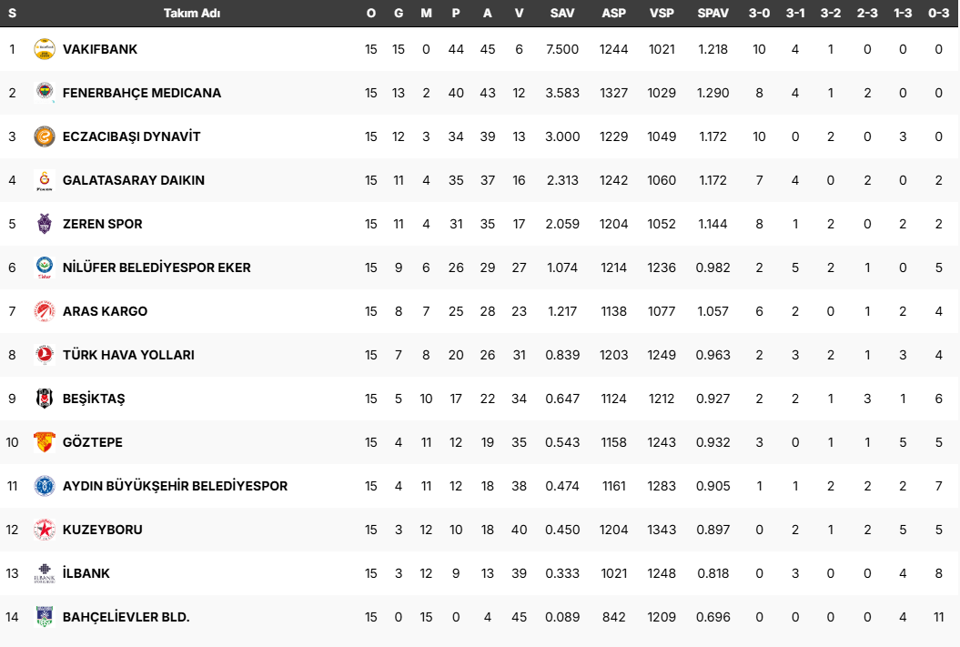 Vodafone Sultanlar Ligi'nde Vakıfbank'ın bileği 15. hafta'da da bükülmedi. Burhan Felek Vestel Voleybol Salonu'nda oynanan mücadelede Vakıfbank, Beşiktaş karşısında 1-3'lük skorla galip gelerek yenilgisiz liderliğini sürdürdü. Lig'de oynanan mücadelelerin ardından oluşan puan tablosu şu şekilde: