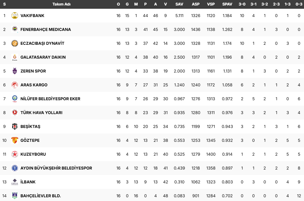 Vodafone Sultanlar Ligi'nde lider Vakıfbank derbide ezeli rakibi Eczacıbaşı Dynavit'e 3-1 mağlup olarak bu sezon ligdeki ilk yenilgisini aldı. Lig'de oynanan yedi karşılaşmanın ardından oluşan puan durumu şu şekilde:
