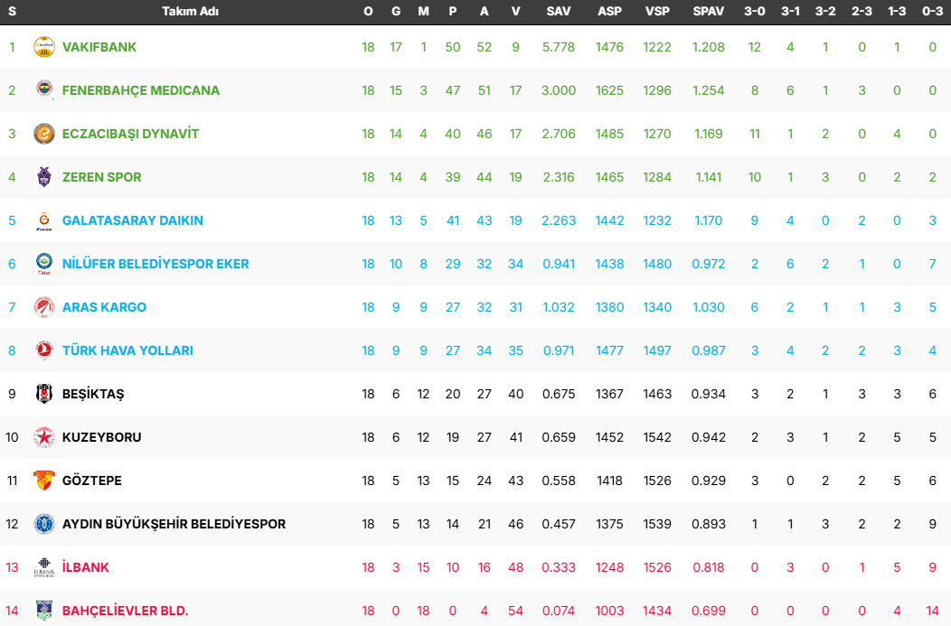 Sultanlar Ligi'nde Vakıfbank, 50 puanla zirvede yer alıyor. Fenerbahçe Medicana ise liderin 3 puan gerisinde, 47 puanla zirve takibini sürdürüyor. 19. haftada oynanacak mücadelelerden önce puan durumu şu şekilde: