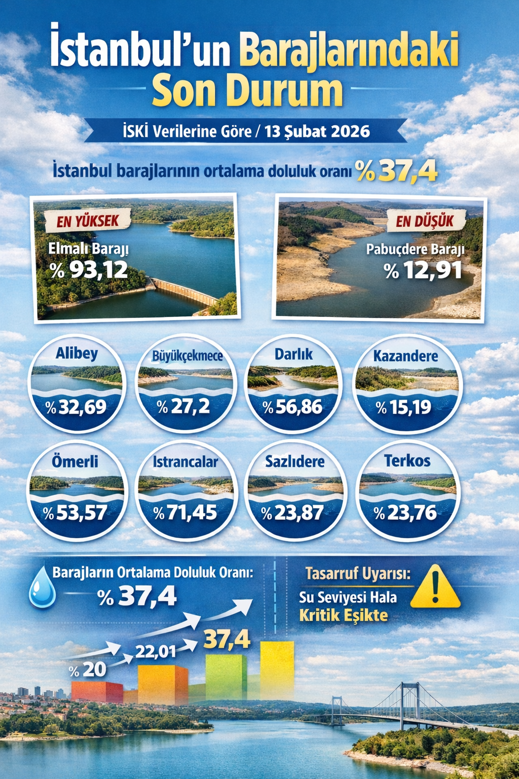 İSKİ verilerine göre 13 Şubat itibarıyla barajlardaki doluluk oranları şöyle: Alibey yüzde 32,69, Büyükçekmece yüzde 27,2, Darlık yüzde 56,86, Elmalı yüzde 93,12, Istrancalar yüzde 71,45, Kazandere yüzde 15,19, Pabuçdere yüzde 12,91, Sazlıdere yüzde 23,87, Terkos yüzde 23,76 ve Ömerli yüzde 53,57.